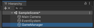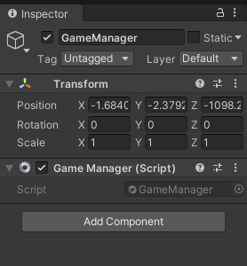짜잔 Script가 생성 된걸 볼 수 있습니다! GameManager 같은 경우 사람들이 많이사용하는 개념이기 때문에 유니티 상의 Script도 다른 Script들의 아이콘 과는 좀 다르게 생겼다는걸 볼 수 있습니다!