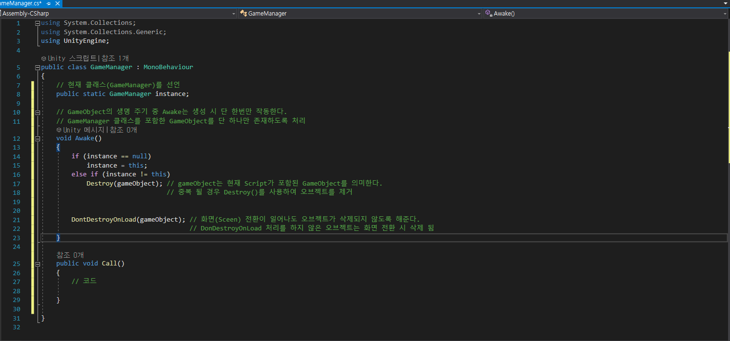 여러 GamaManager를 남용 할 수 없게 만드는 기본적인 안전장치 코드라고 보면 좋겠네요!