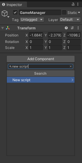 그리고 GameManager의 Inspector 창에서 new script를 생성해 주겠습니다! 이름은 GameManager로 할게요!