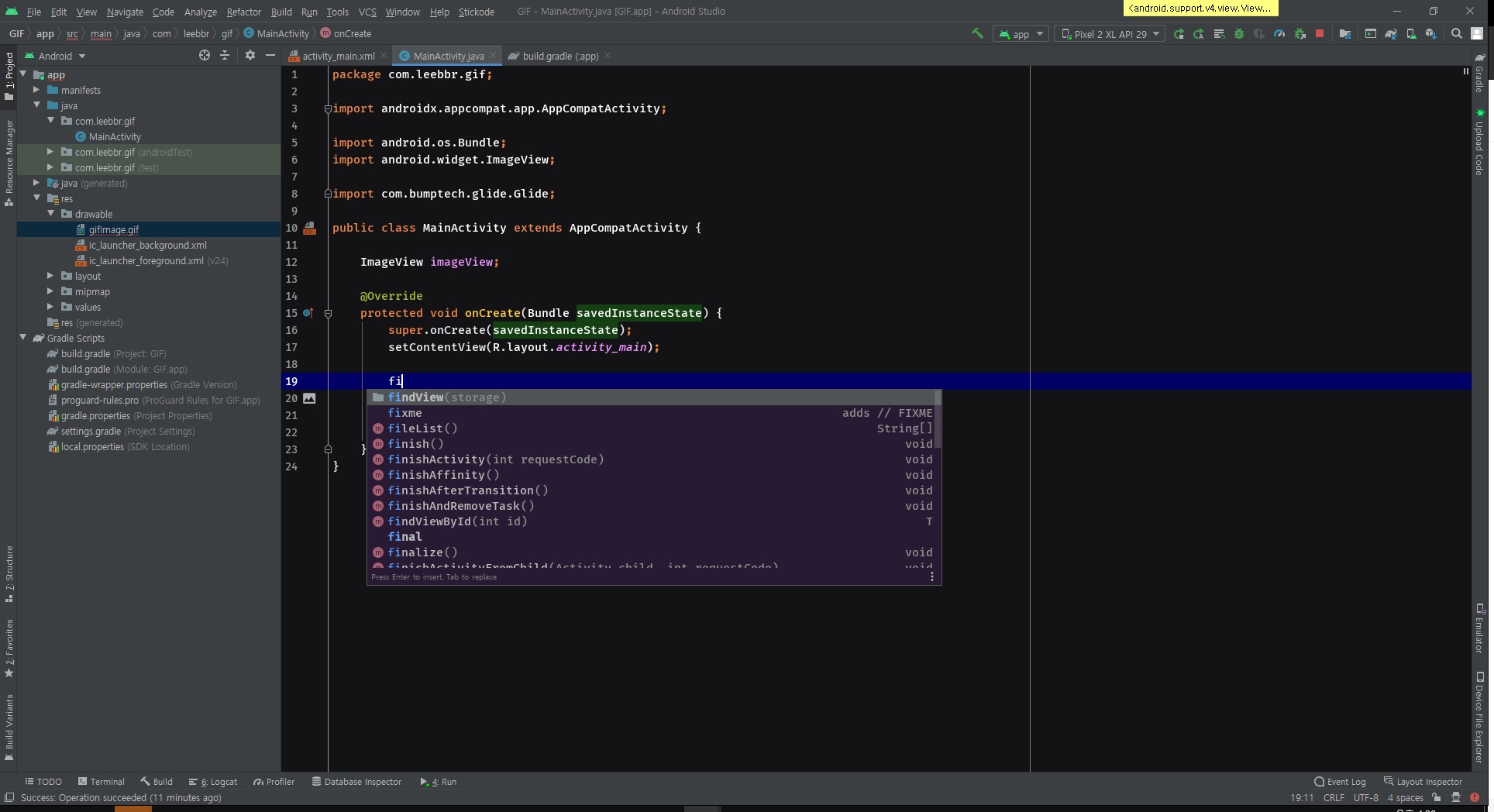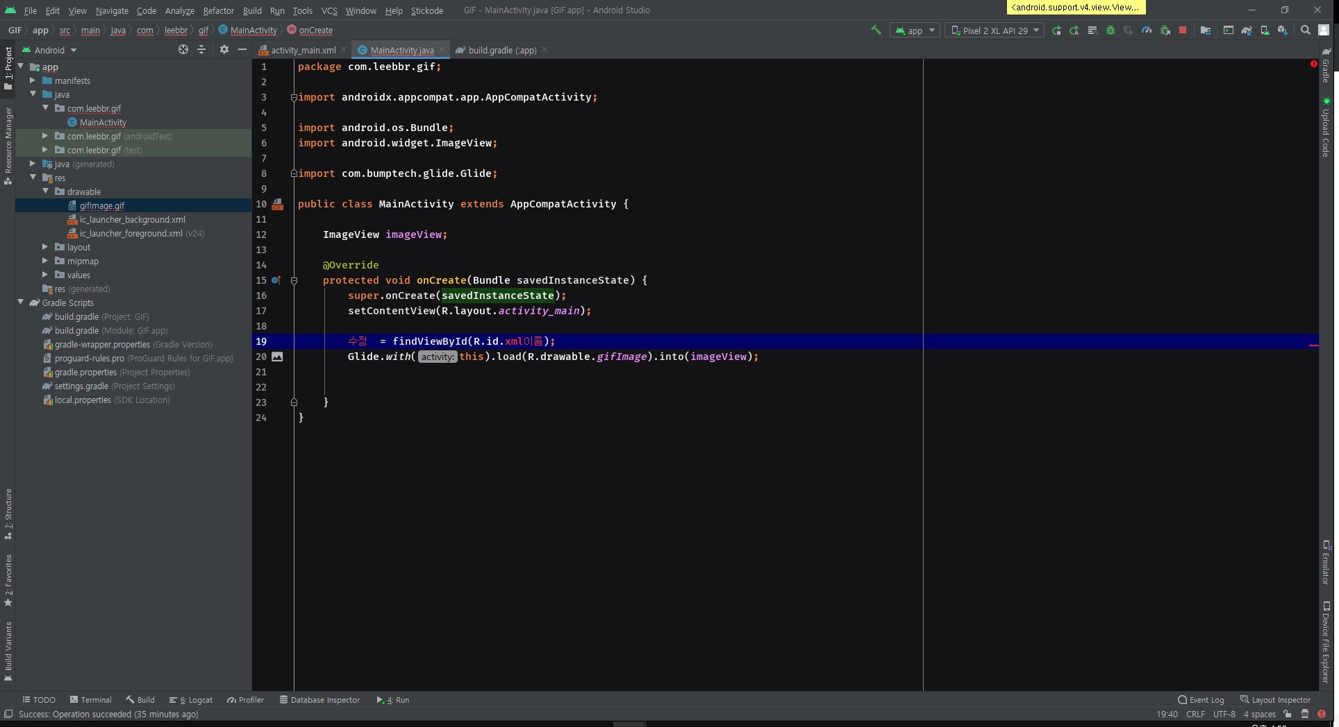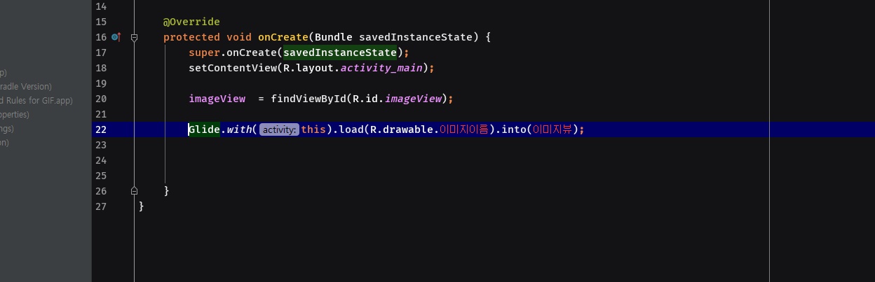 이미지 뷰에는 activity_main.xml 에서 설정한 imageView의 아이디를 입력해 줍니다.