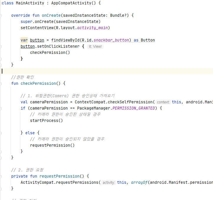 button의 onclickListener 안에 권한 확인 기능을 실행하기 위해 checkPermission()를 추가해 줍니다.