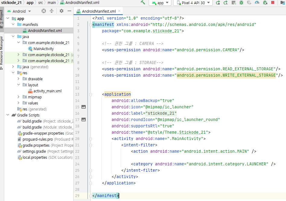 카메라 기능 권한을 요청하기 위해 AndroidManifest.xml에 실행 권한을 추가해줍니다.
