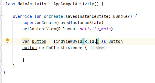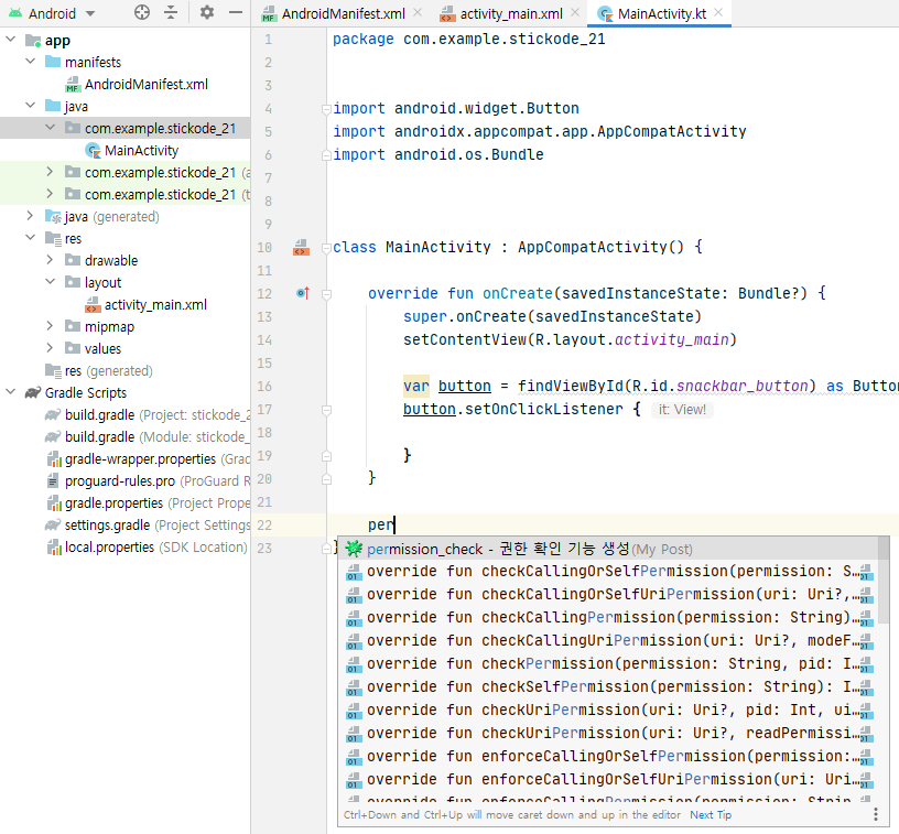 id. 뒤에는 xml에 있는 버튼 id 값(snackbar_button)을 입력해주면 됩니다.