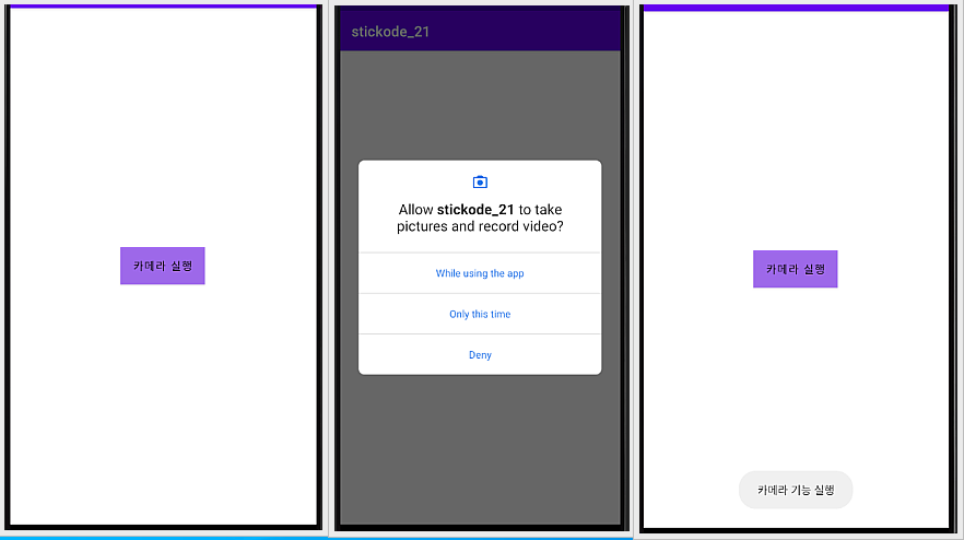 프로젝트를 실행하면 아래 사진과 같이 나오는데, deny을 제외한 다른 버튼을 누를 경우 카메라 실행 버튼을 누를 때마다 Toast 창이 실행되는 것을 확인할 수 있습니다.