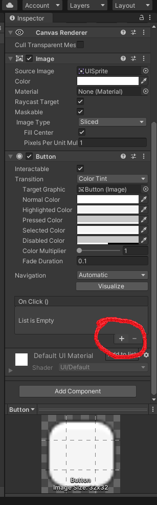 Button의 Inspector 부분을 보면 On Click() 이란 탭이 존재 하는데 그곳에서 + 버튼을 눌러줍니다.