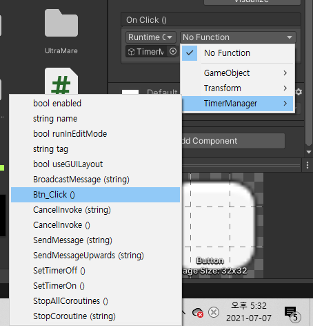 그렇게 되면 No function 부분에 TimerManager 텝이 생길텐데 그곳에서 Btn_Click()을 선택 해 줍니다. Btn_Click은 스크립트에 만들어 놓았던 메소드를 지정한 것입니다.