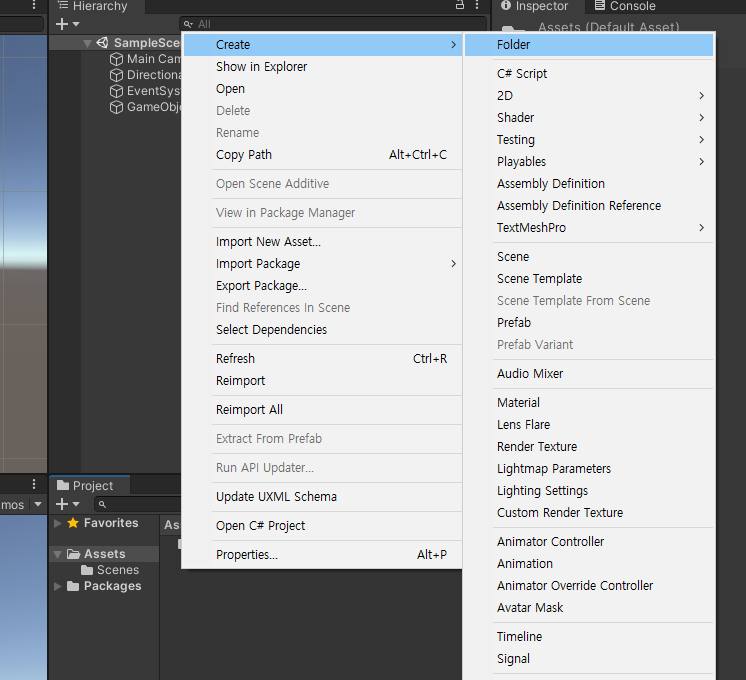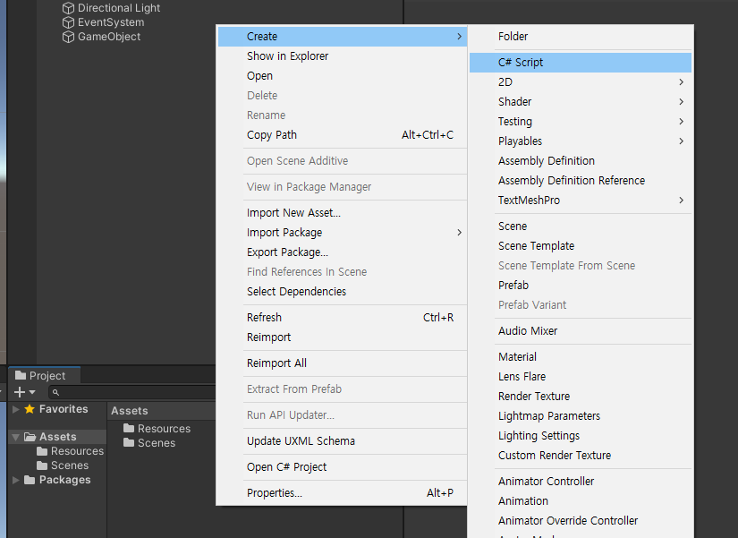 1. Project 창에서 Assets파일을 선택 후 Assets 창 내에서 마우스 우클릭 -> Create -> C# Script를