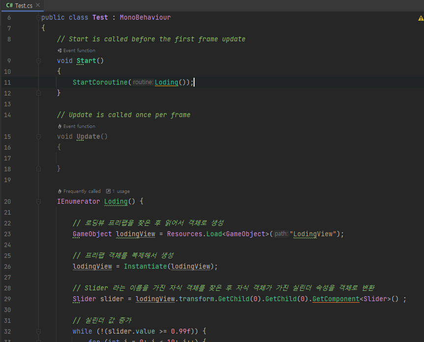 '로딩 코루틴 생성' 이벤트를 누를 경우 코드가 자동으로 완성됩니다.