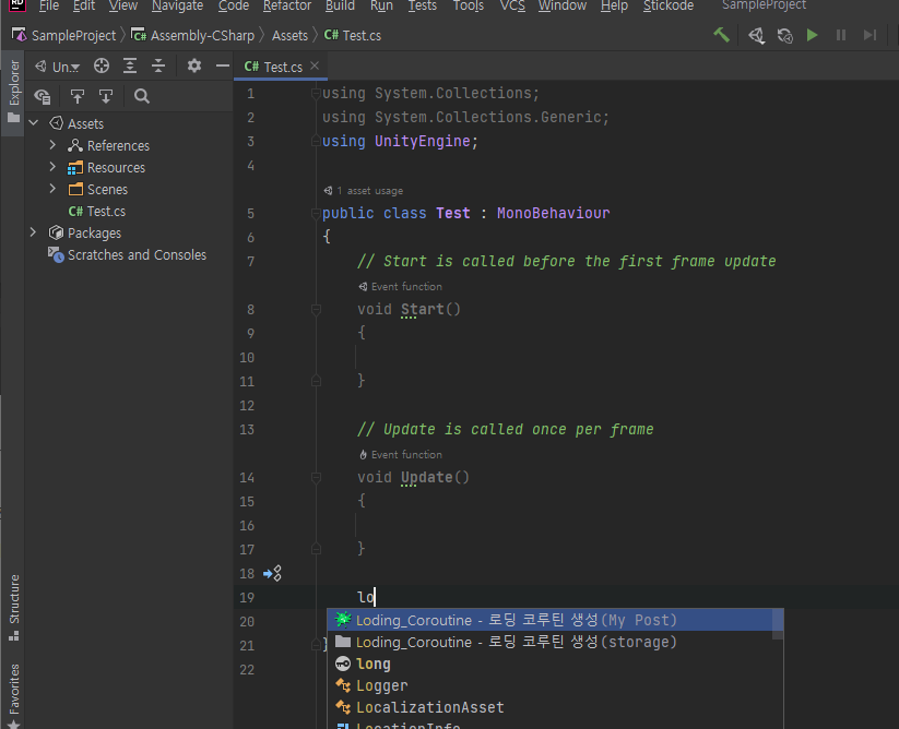 스틱 코드를 활용한다면, 클래스에서 'lo' 까지만 작성했을 때 '로딩 코루틴 생성' 이벤트가 나타납니다.