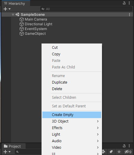 2. Hierarchy 창안에서 마우스 우클릭 -> Create Empty 선택해서 빈 게임 오브젝트를 생성해줍니다.