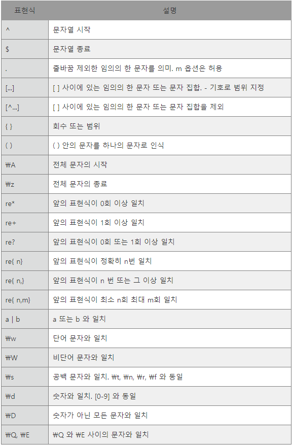 정규 표현식 관련한 문자를 표로 보여드리겠습니다.`