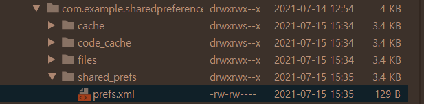 SharedPreferences는 어플리케이션에 파일 형태로 데이터를 저장한다. 데이터는 (key, value) 형태로 data/data/패키지명/shared_prefs 폴더 안에 xml 파일로 저장된다. 해당 파일은 어플리케이션이 삭제되기 전까지 보존된다.