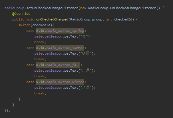 textview에 선택한 계절에 맞는 단어가 출력되도록 코드를 추가해줍니다.