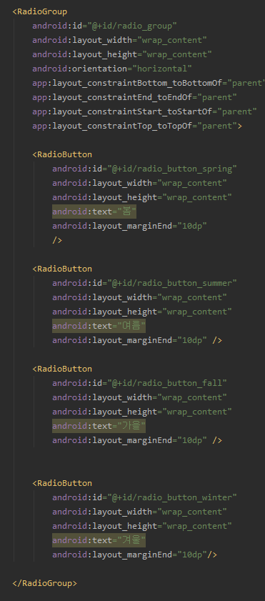 xml 파일에 자동으로 Radio Group의 기본 코드가 작성됩니다.