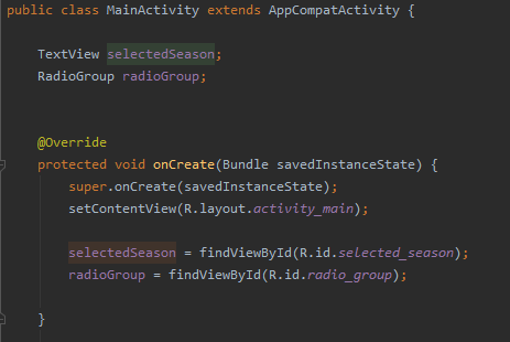 먼저, 선택된 항목을 띄워줄 텍스트 뷰와, 라디오 그룹을 선언해줍니다.