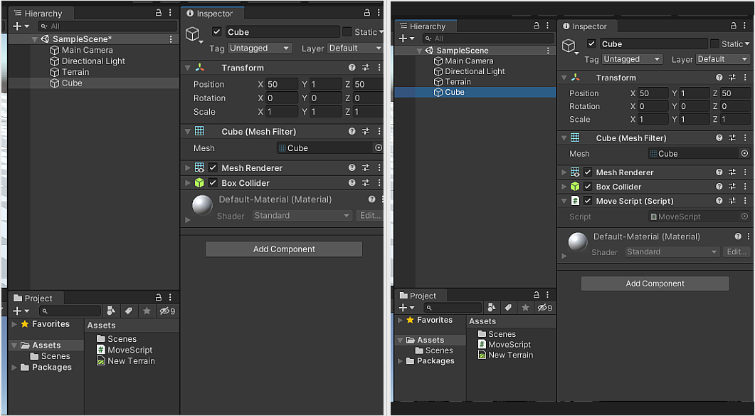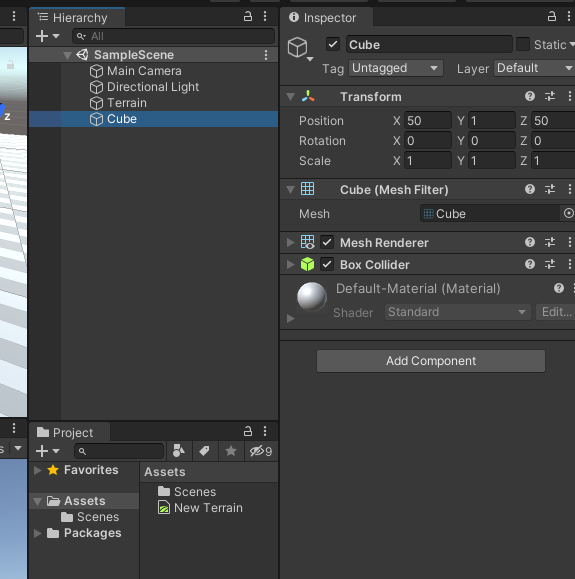 다음으로 큐브의 위치를 Terrain 정중앙으로 배치하기 위해 큐브 오브젝트를 선택 후