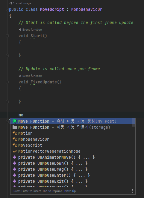 스틱 코드를 활용한다면, 클래스에서 'mo' 까지만 작성했을 때 '유닛 이동 기능 생성' 이벤트가 나타납니다.