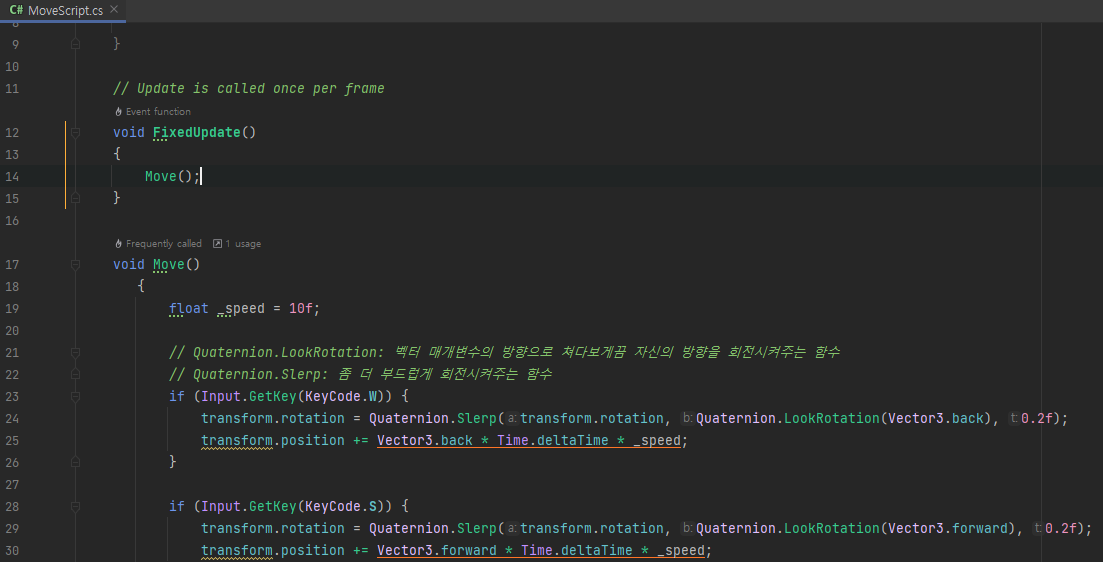 함수를 사용하기 위해 FixedUpdate() 함수 안에 아래 사진처럼 함수 이름을 추가해줍니다.