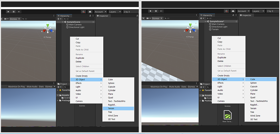 여기서 Terrain, Cube 오브젝트를 선택해서 생성해줍니다.