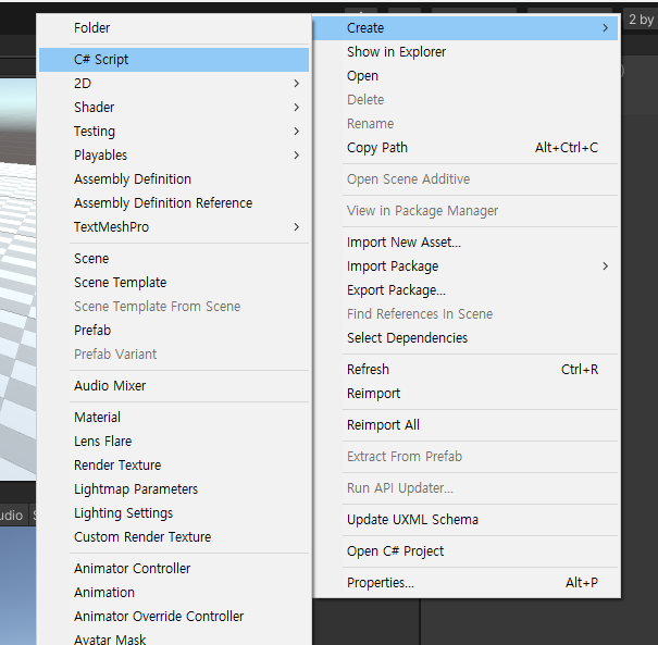 Assets 창 안에서 마우스 우클릭하면 아래와 같은 사진처럼 메뉴 창이 나오는데