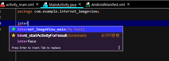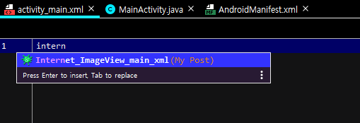 Internet_ImageView_main 이라는 태그를 입력하면 스틱코드 탭이 생성되어 원하는 코드를 한번에 불러 올 수 있습니다.