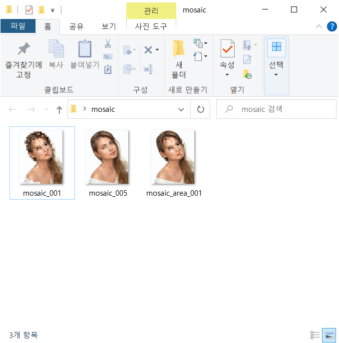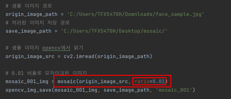 우선 샘플 이미지의 경로와 처리된 이미지를 저장할 경로를 정해줍니다. 그리고 opencv 모듈로 읽은 샘플이미지 소스를 위에서 선언한 모자이크 기능을 불러서 모자이크 해줍니다. 파라미터 ratio 에 따라서 모자이크 비율을 선택 해줄수 있습니다. 마지막으로 위에서 선언한 처린된 이미지를 저장하는 기능을 사용합니다.