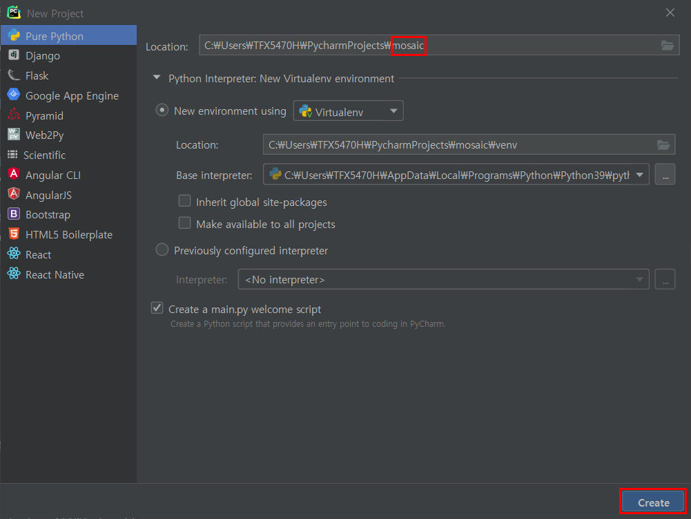 - 새로운 프로젝트 생성하기를 누르신 다음 프로젝트 명을 정해주시고 생성 버튼을 눌러줍니다.