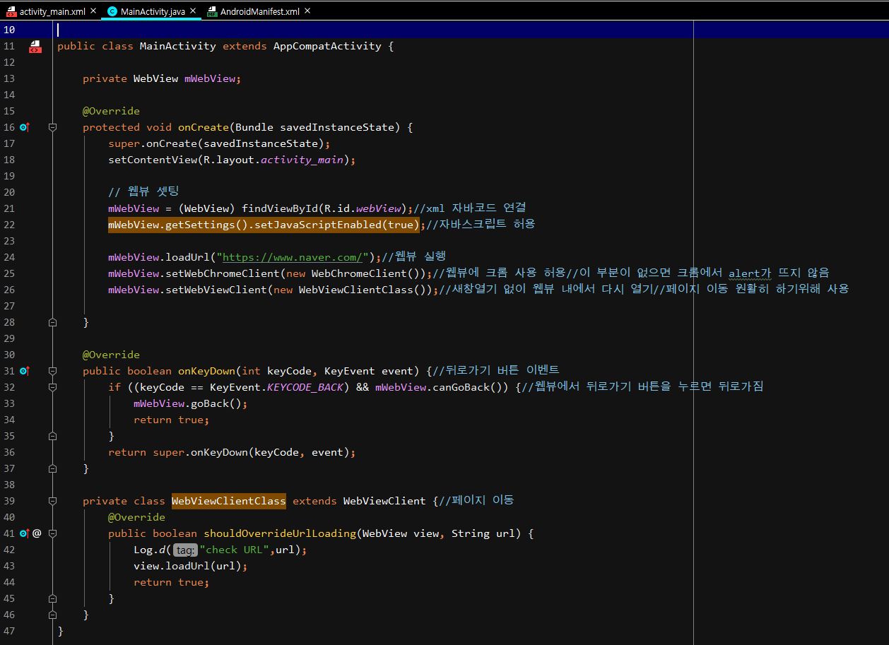 mWebView.loadUrl("https://www.naver.com/");//웹뷰 실행