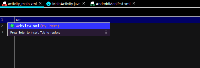 - webview를 입력하면 스틱코드 탭이 나옵니다.
