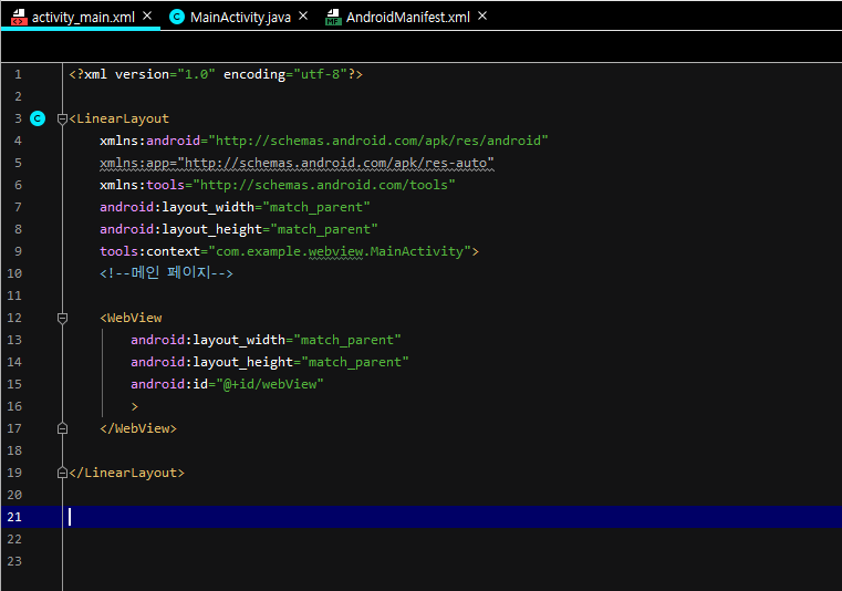 이번 시간에는 앱에서 WebView를 만들어서 특정 인터넷 주소로 연결해 보겠습니다.