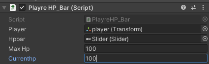 저는 수치는 이렇게 입력해 주었고요 Player와 Hpbar 변수에 Player 오브젝트와 Slider를 지정해 주었습니다.