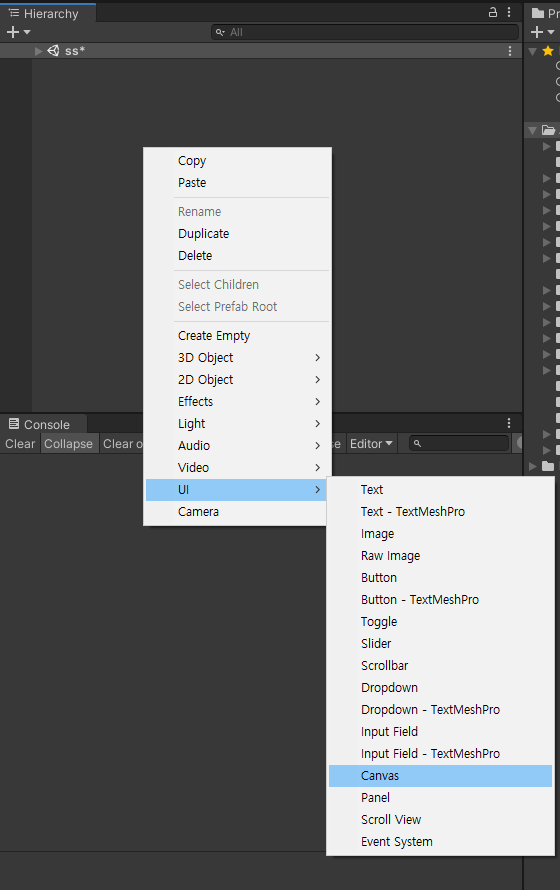 가장 처음 할 일은 체력바를 만들어 주는거겠죠? 유니티를 켜고 Hierarchy창에서 Slider를 만들어 주도록 하겠습니다~!