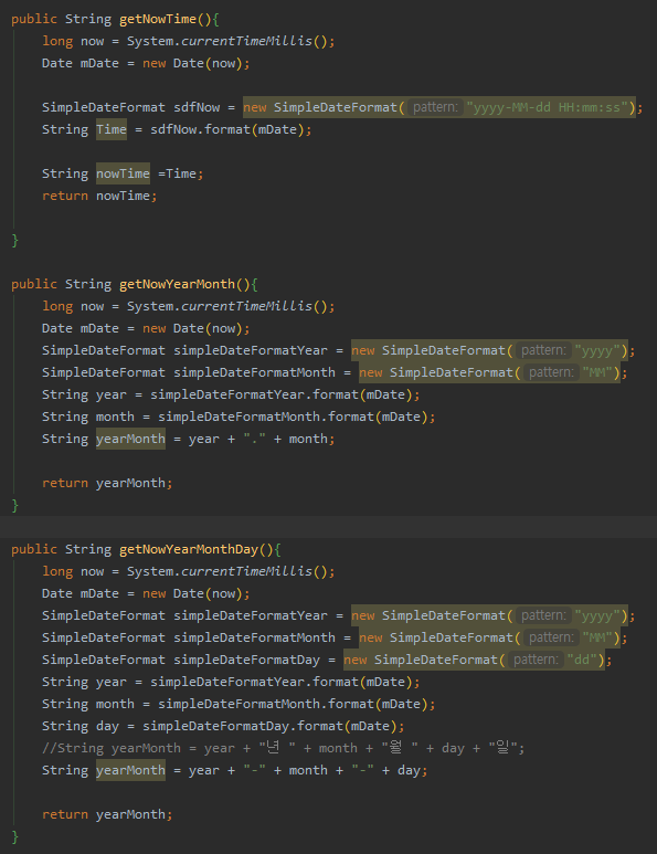 먼저 java에서는 simpleDateFromat 이라는 메소드를 통하여 특정 형식으로 날짜를 받아 올 수 있습니다.