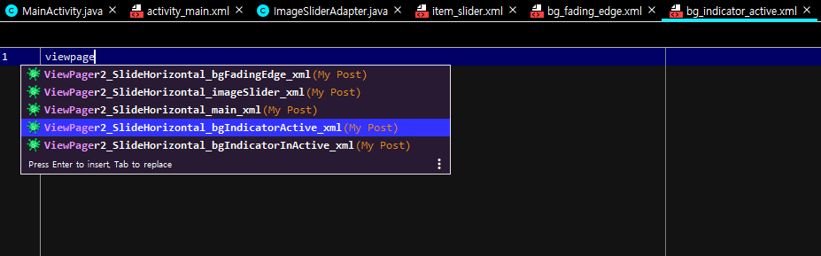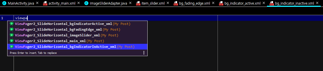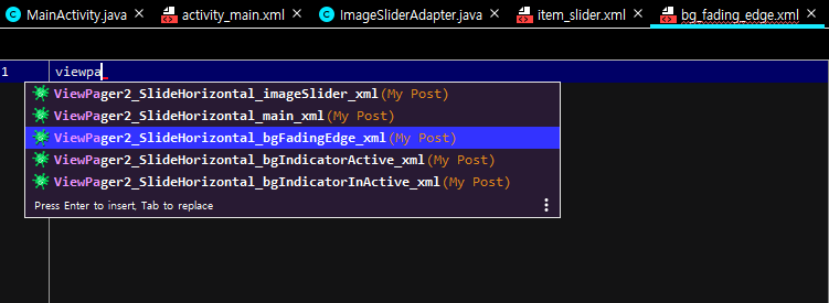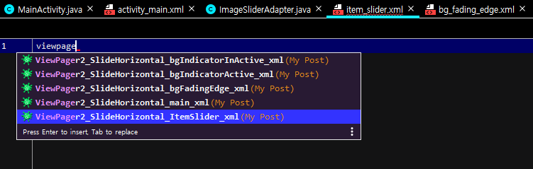 viewpager2 태그를 입력하면 스틱코드 탭이 생성되고