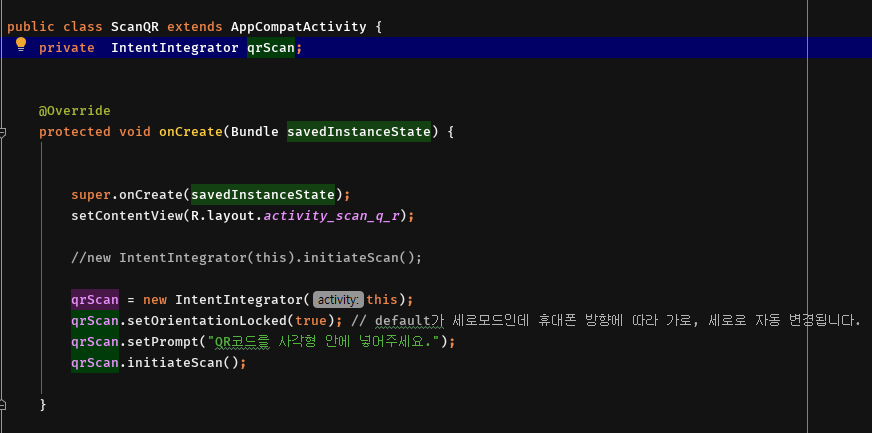 그리고 ScanQR에서 IntentIntegrator 클래스를 선언해주세요.
