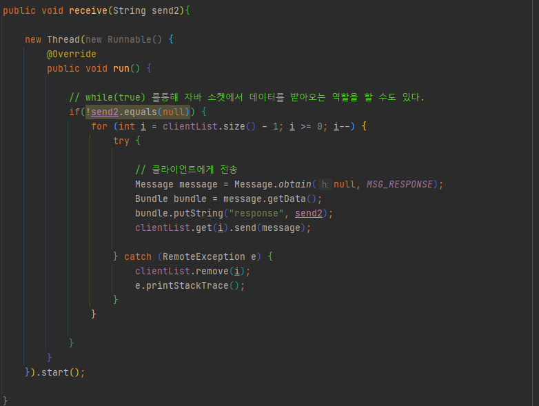 받은 데이터를 Service의 receive()를 통해 다시 Activity로 전달해주고 있습니다.