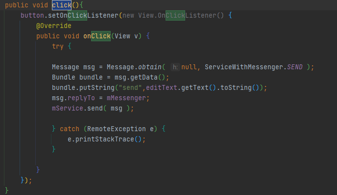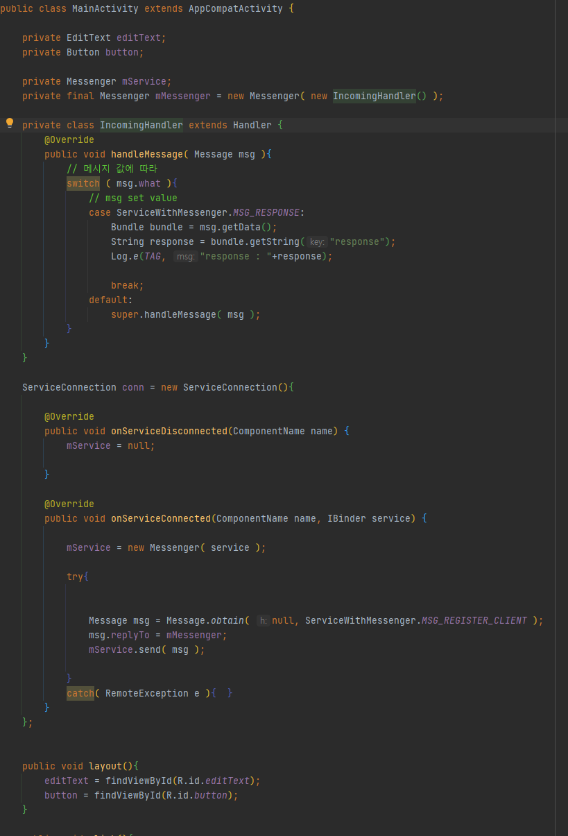 이렇게 Messenger를통해 Service의 인터페이스를 생성해 Activity 와 Service 정보를 쉽게 주고받을수 있도록 하였습니다.