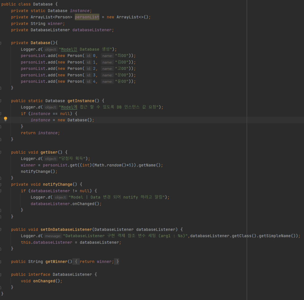 Logger.d("Model에 접근 할 수 있도록 DB 인스턴스 값 요청");
