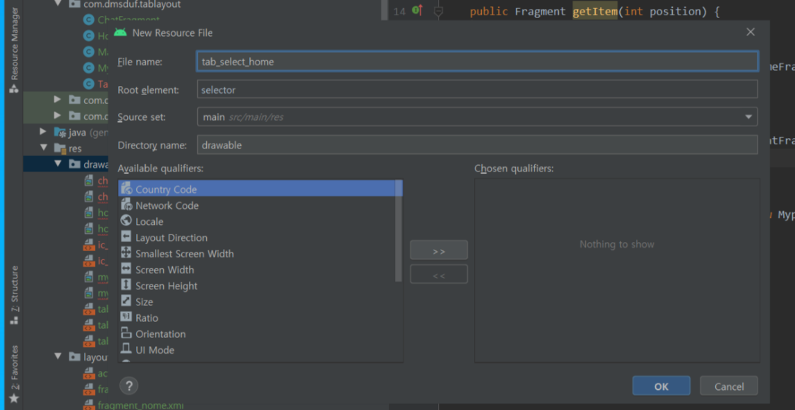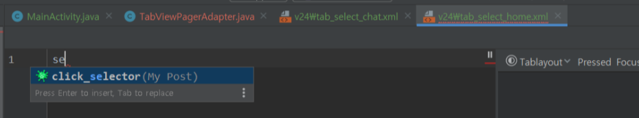 메뉴에 개수에 따라 resource파일 또한 동일하게 만들어주세요! 저는 총 3개(홈,채팅,마이페이지)의 탭 메뉴를 보여주기 위해 3개의 resource(tab_select_home , tab_select_chat , tab_select__mypage)파일을 만들었습니다