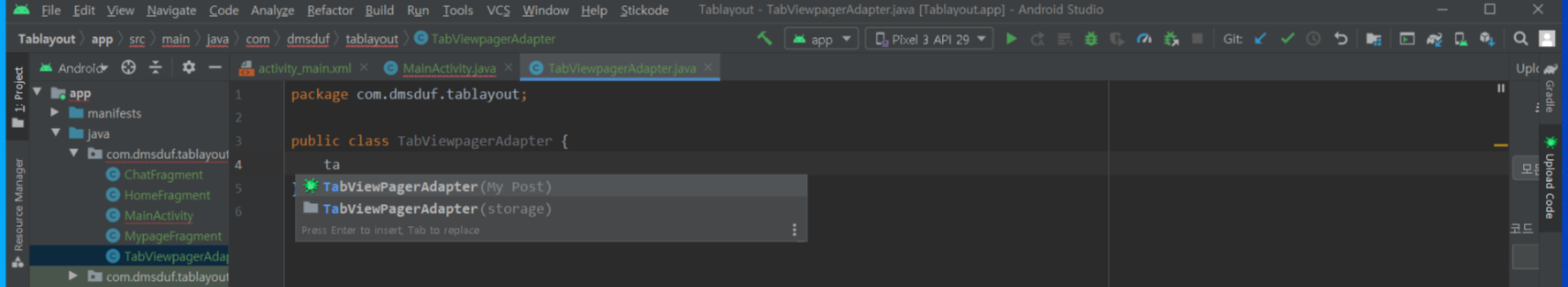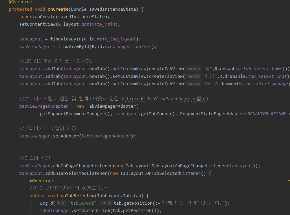 메인액티비티에서 여태까지 구성한 텝레이아웃 , 뷰페이저 , 뷰페이저 어댑터를 생성한 후 연결해주도록 합니다.