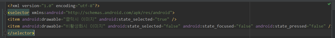 생성된 resource파일에서 stickode의 click_selector라는 포스팅을 이용하면 아래와 같은 코드가 바로 생성됩니다. 이에따라 활성화/비활성화 이미지를 넣어주세요!