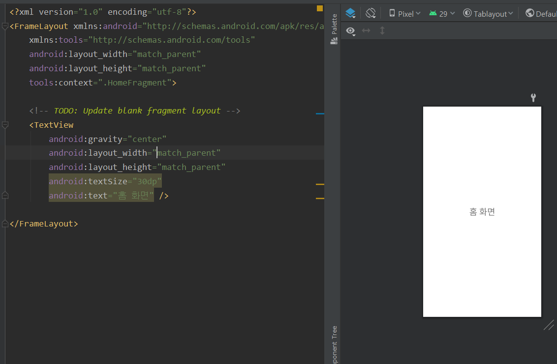 프래그먼트 생성 후 각 화면을 구분하기 위한 텍스트를 적었습니다.("홈 화면")