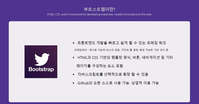 부트스트랩은 트위터에서 사용하는 각종 레이아웃, 버튼, 입력창 등의 디자인을 CSS와 Javascript로 만들어 놓은 것이다. 웹 디자이너나 개발자 사이에서는 웹 디자인의 혁명이라고 불릴 정도로 폭발적은 반응을 얻는 프레임워크이다. 라고 합니다.