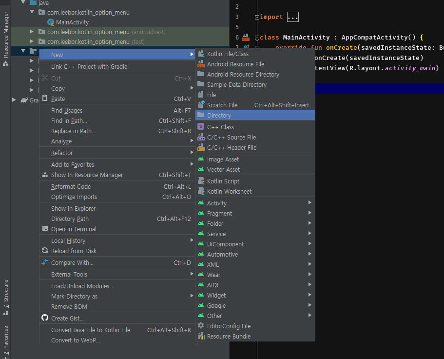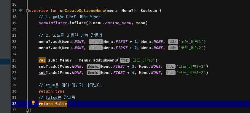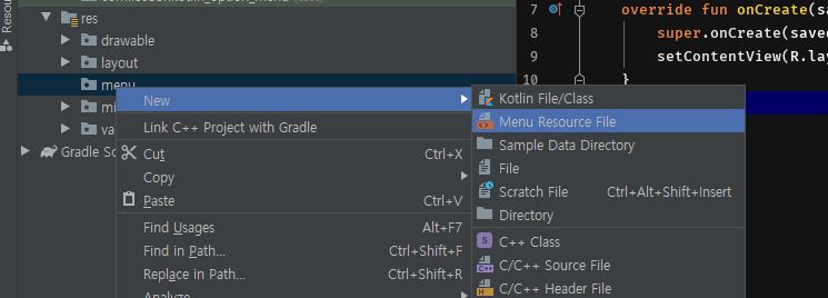 4. 메뉴를 앱바에 붙이기 위해서는 MainActivity에 작성해야 한다.
