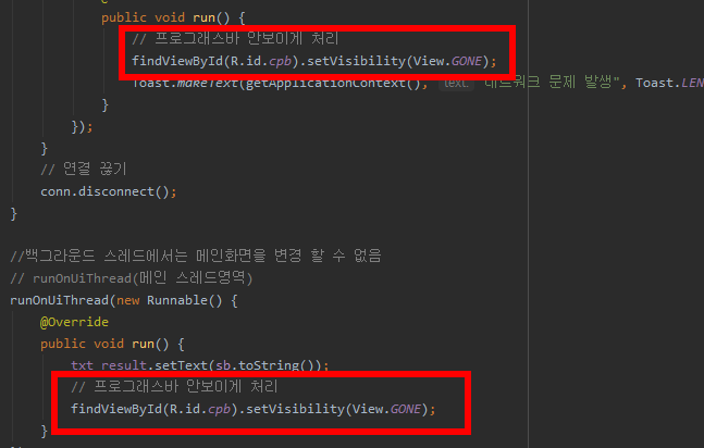 통신이 끝나면 프로그레스바를 없애는 코드까지 추가해서 셋팅을 완성 해보겠습니다.