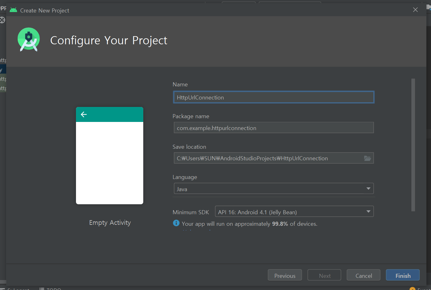 이번시간에는 안드로이드 자바로 HttpUrlConnection을 사용해 통신하는 예제를 만들어보겠습니다.