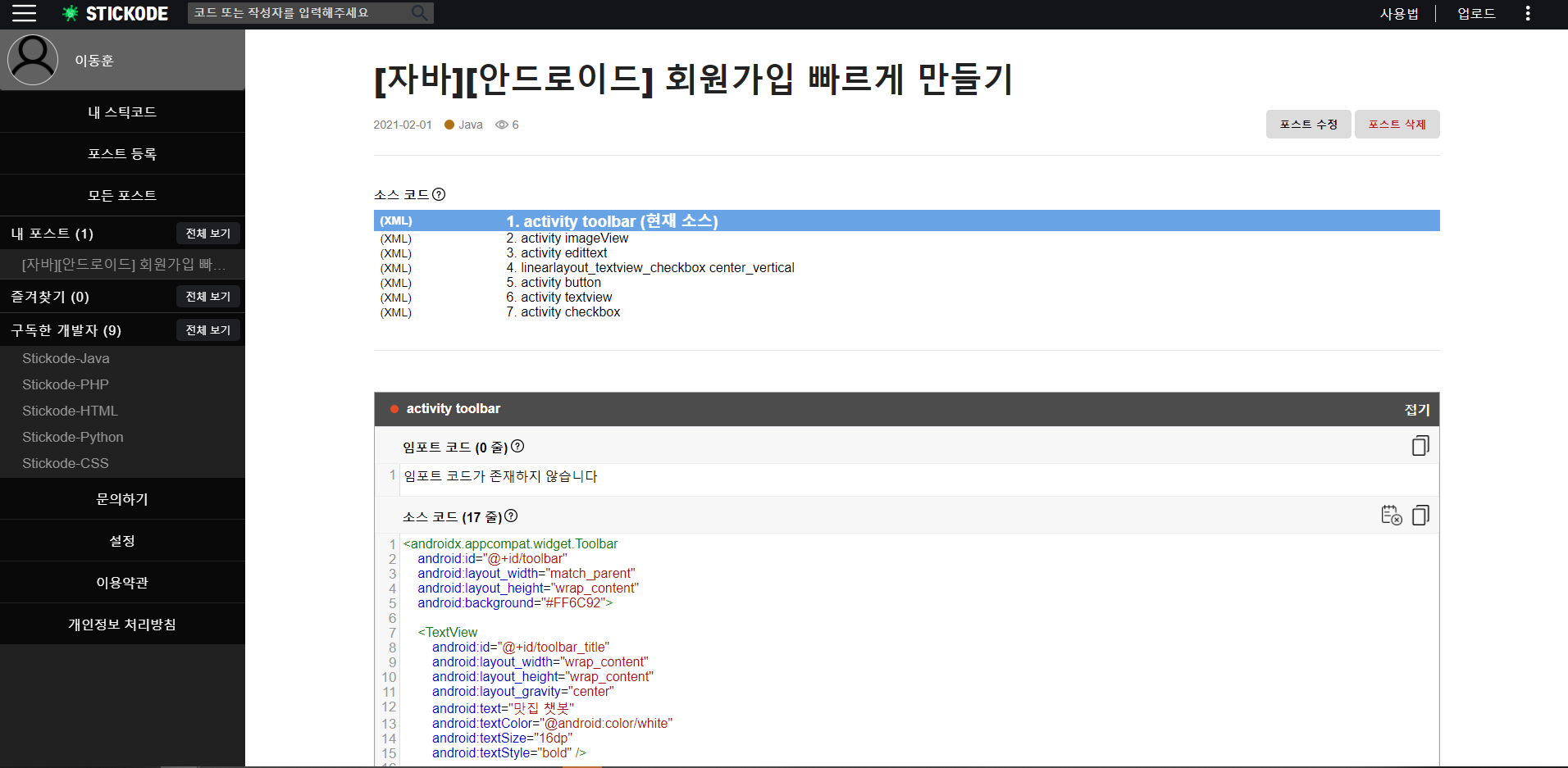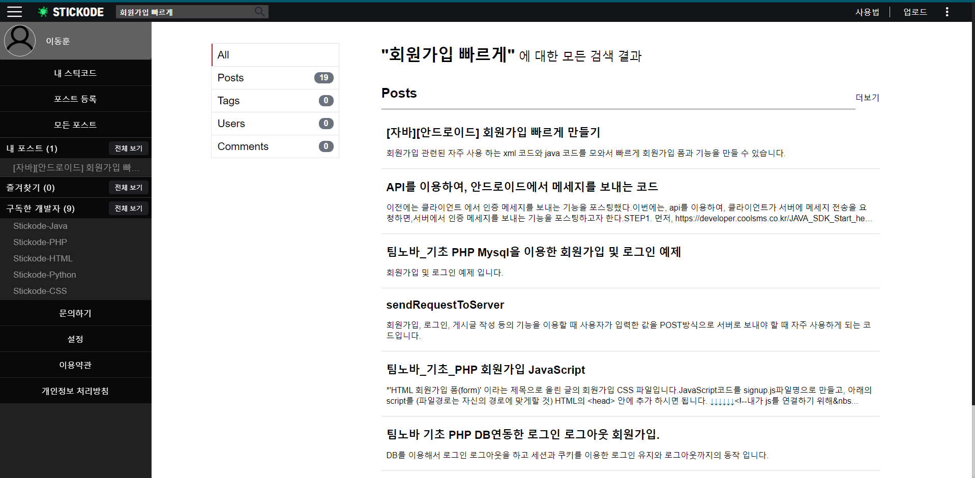 스틱코드 회원가입 및 포스트 즐겨찾기 하기