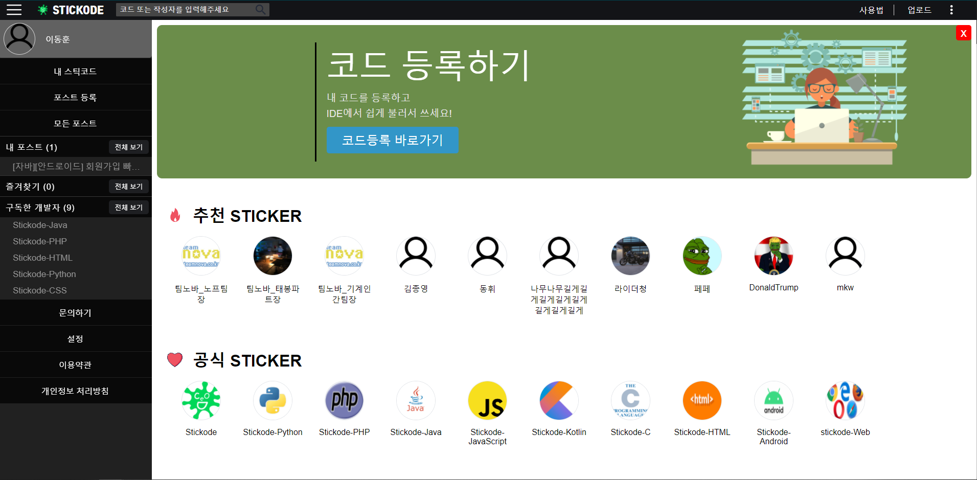 - 회원가입 방법 url: stickode.com/signup.html(이메일 인증을 통해서 간편하게 가입 가능)