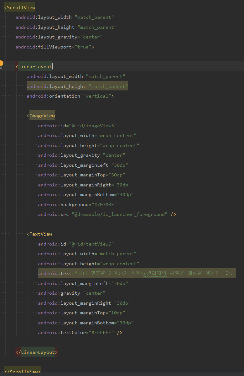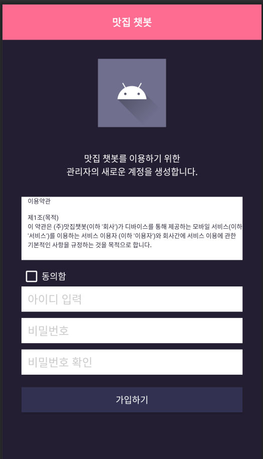 android:text="맛집 챗봇를 이용하기 위한\n새로운 계정을 생성합니다."