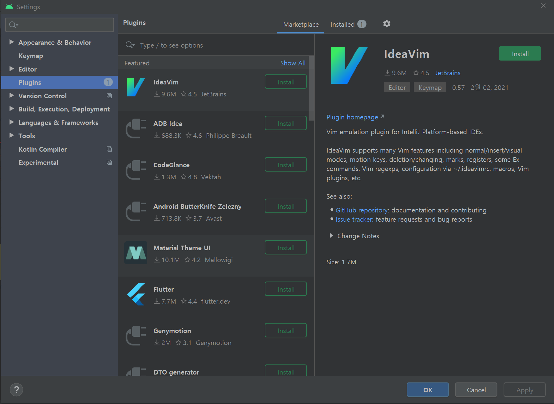 안드로이드 스튜디오 세팅에서 plugins 클릭